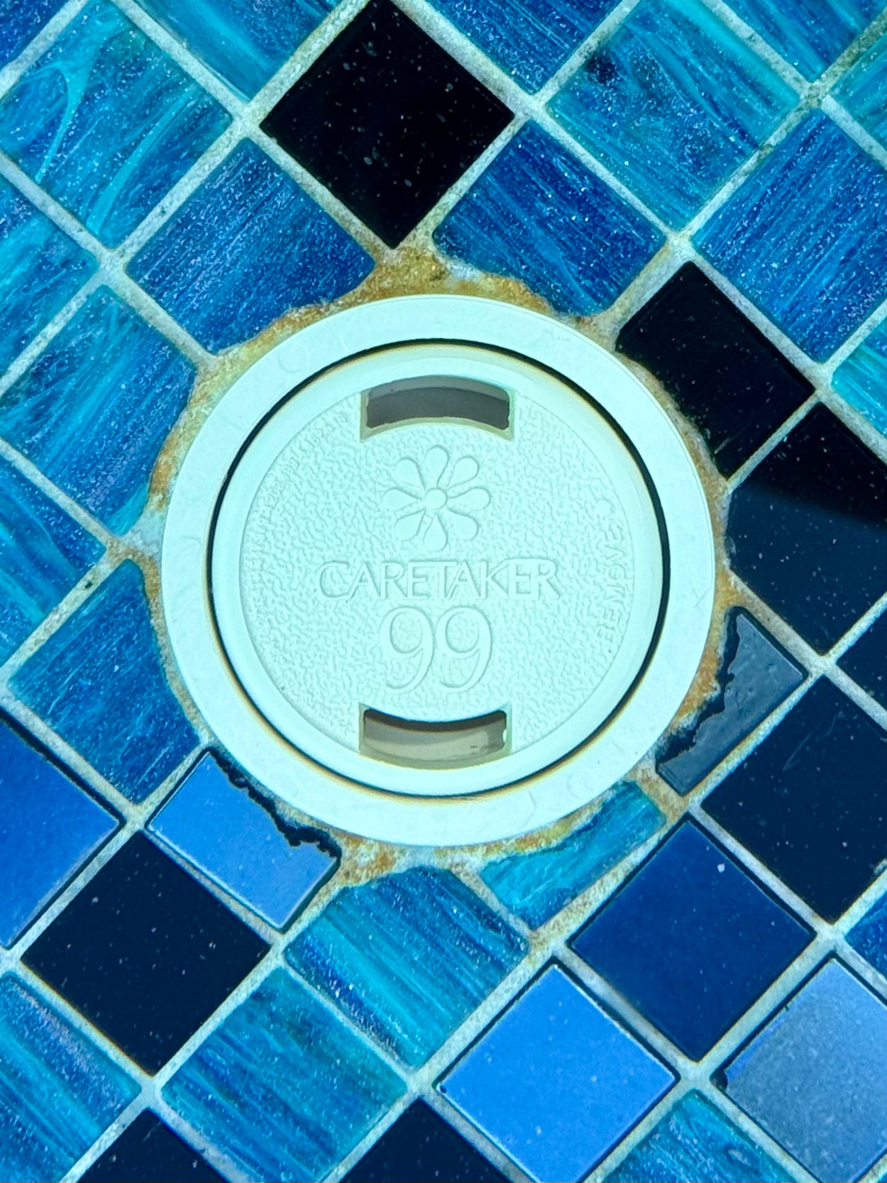 The memory of that moment with Timo floated through my mind again as I noticed a little round plastic circle on the step under the water next to me. There was a word written on it. I peered down and looked a little closer: “CARETAKER 99” stared back at me.